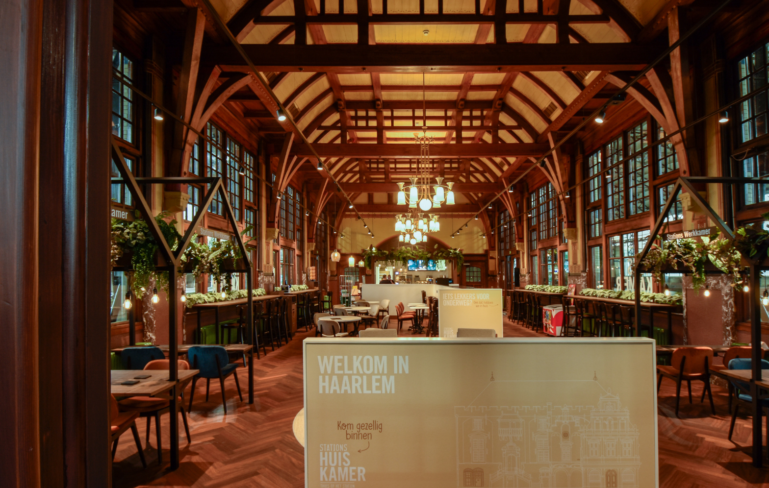 The Station Living Room in Haarlem is housed in a listed building — a former restaurant that has been lovingly restored. The authentic herringbone floor, beamed ceiling, and original chandeliers are once again visible.