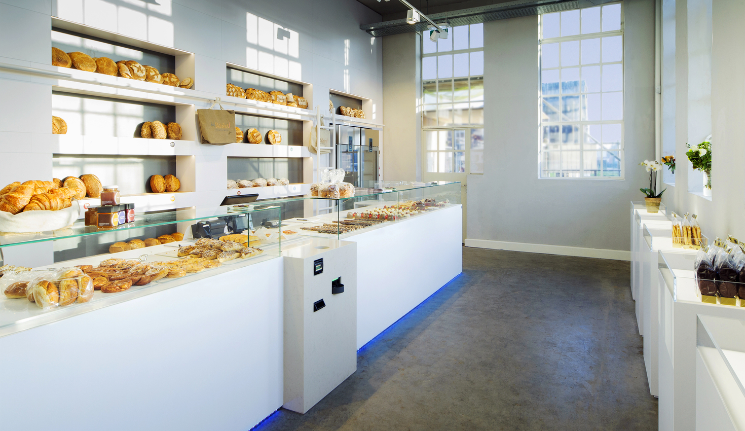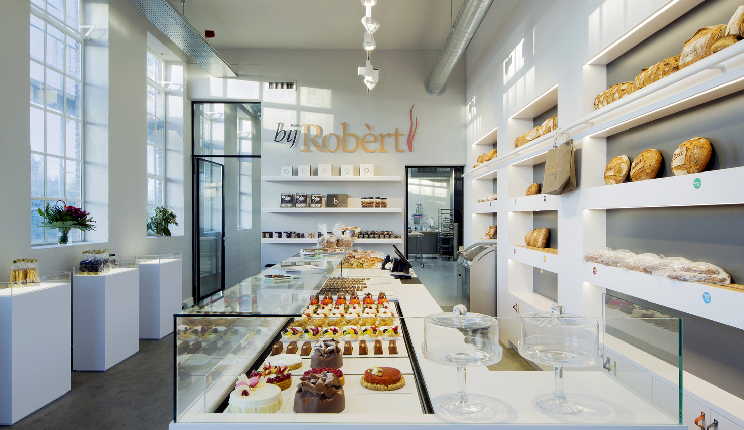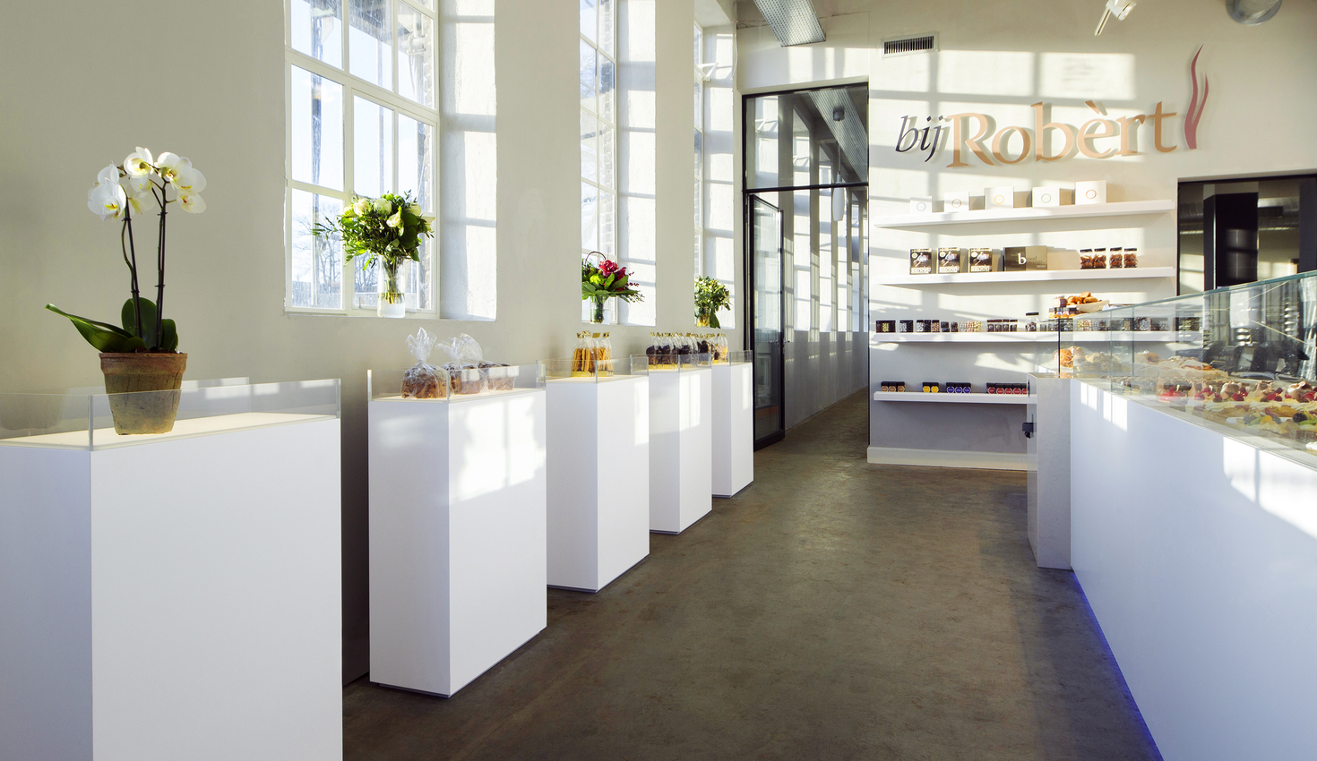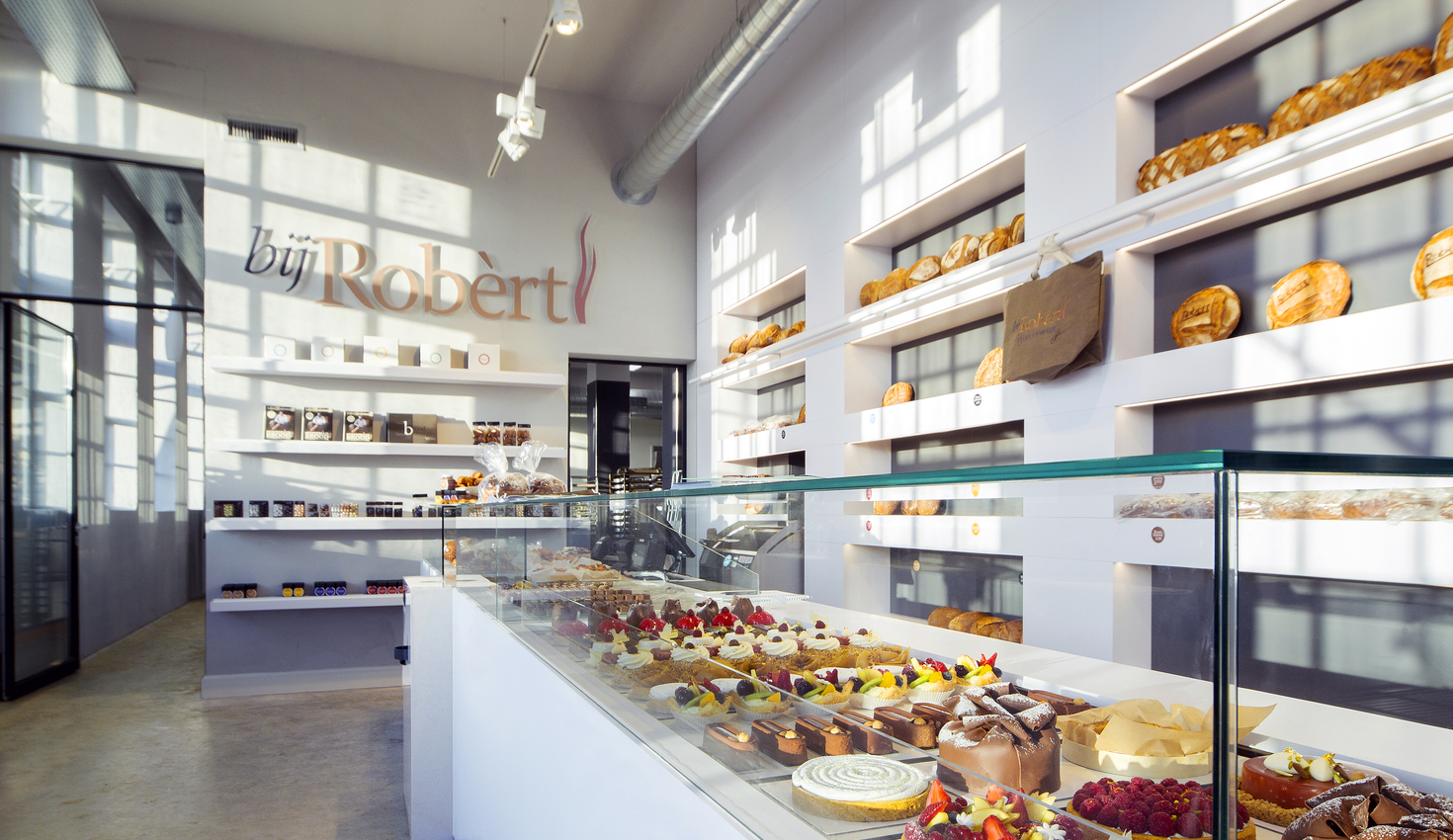 With its sleek design and modern store concept, Bij Robèrt distinguishes itself from other bakery stores. The sleek, clear design of the store gives visitors the feeling that they are visiting a jeweler where they can admire delicious juwels in the display cases. From the shop, visitors enter a long glass corridor, nearly 45 meters long, which provides a full view of the bakery and pastry shop. “We have no secrets and are happy to show them,” explains Robèrt.