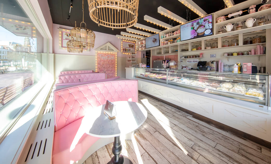 The instagrammable interior designed by Gilbert Comhair has been designed in detail. Showbiz lighting in contrast with the dark ceiling, the sweet pink padded sofas & the pink stripe wallpaper, a warm white counter filled with an assortment of delicious (colorful) treats.