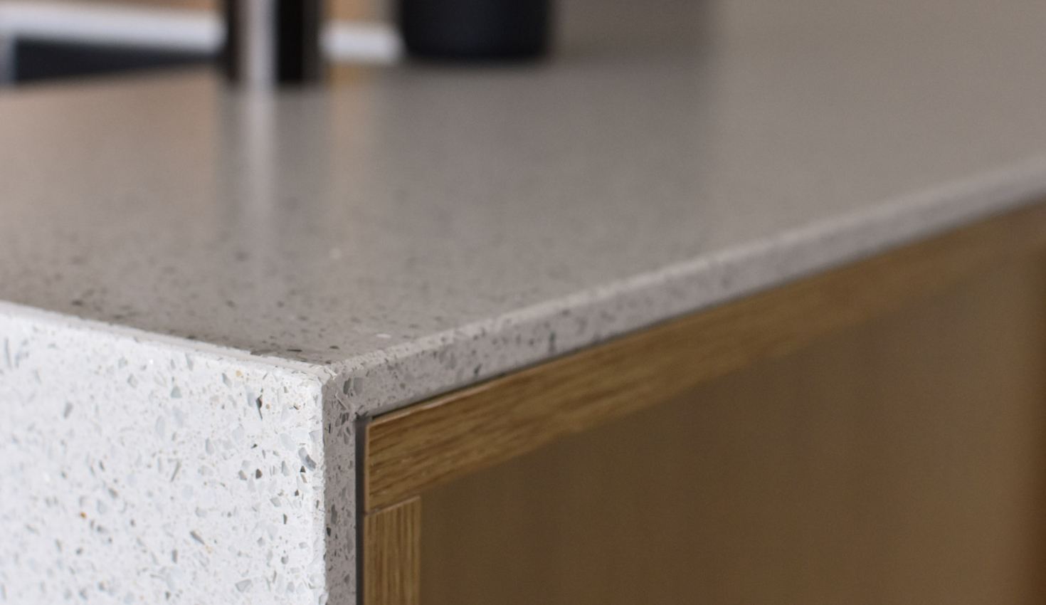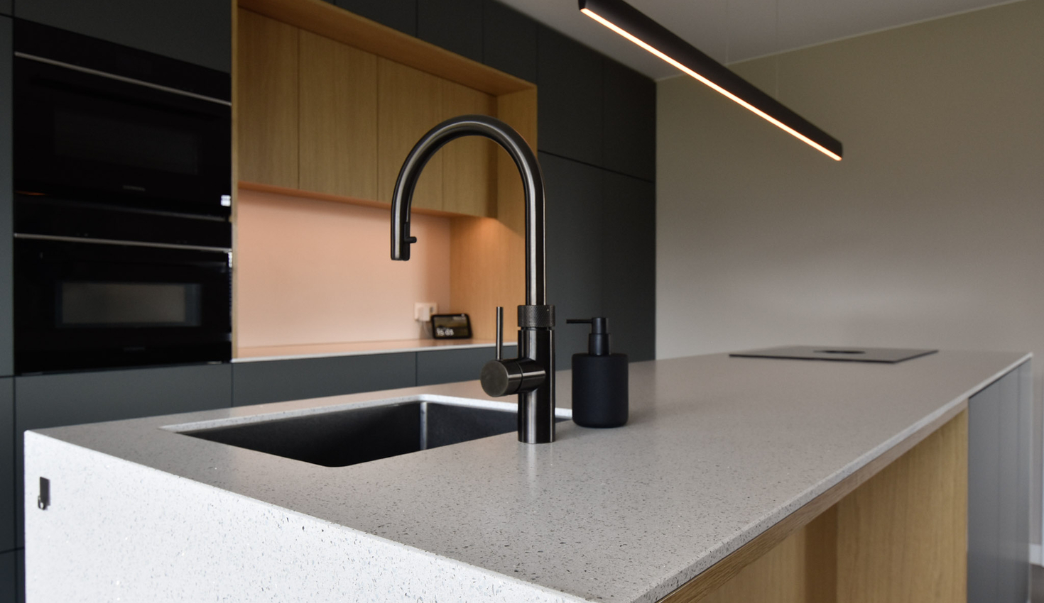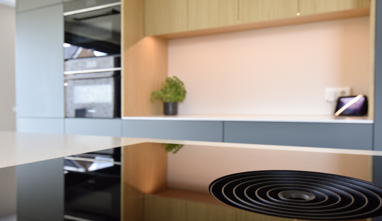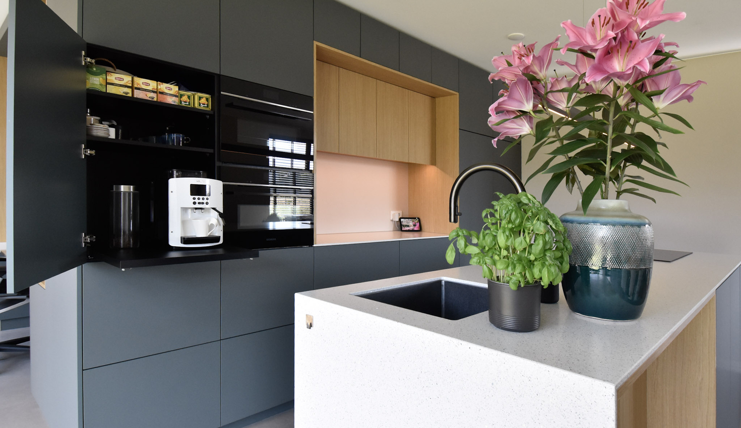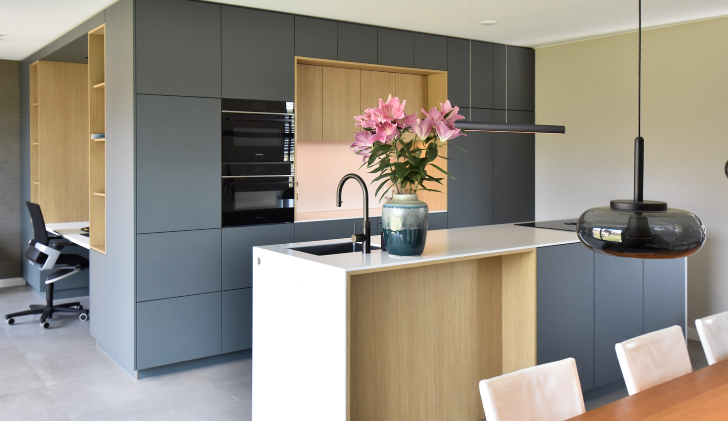 The kitchen and home office form one cohesive whole. Executed in oak and Fenix, with a Silestone worktop. In the home office, a PET felt back panel adds calm and improves acoustics.