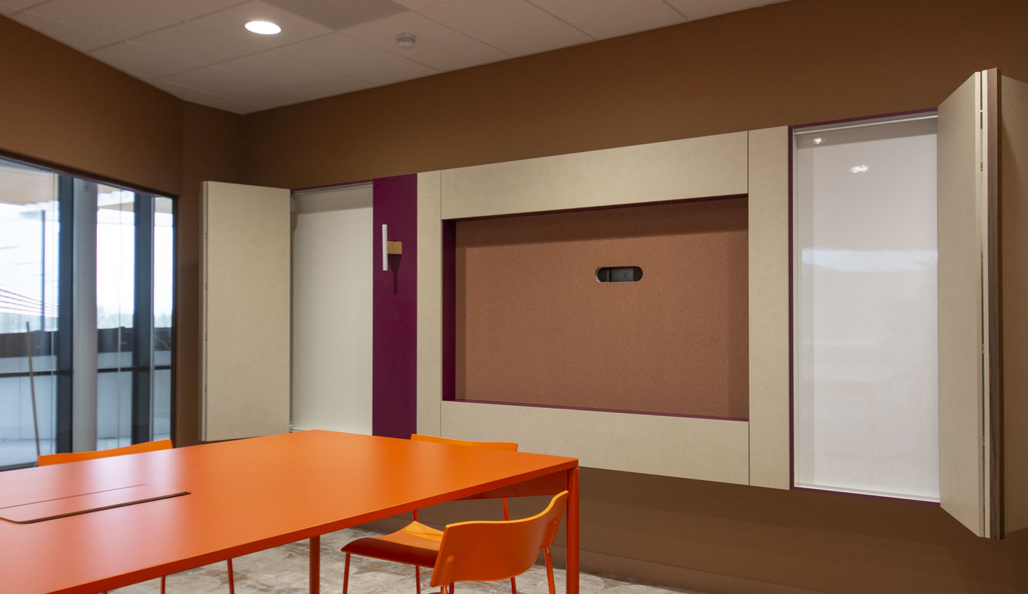Het tv-scherm vormt het middelpunt met aan weerszijden een whiteboard en flipover. Deze zijn uit het zicht weggewerkt achter panelen en komen tevoorschijn via schuifvouwdeuren.
