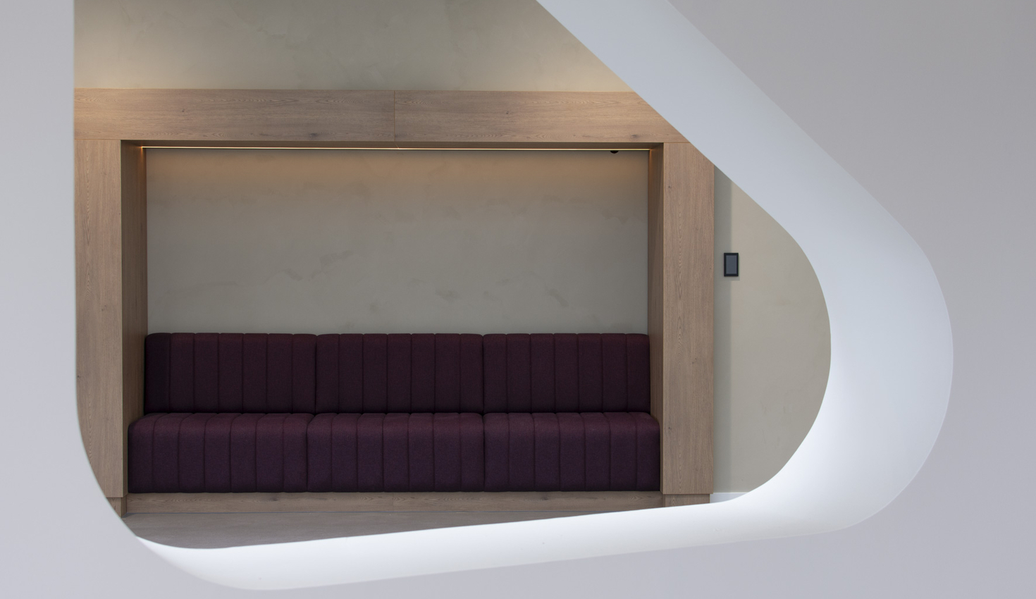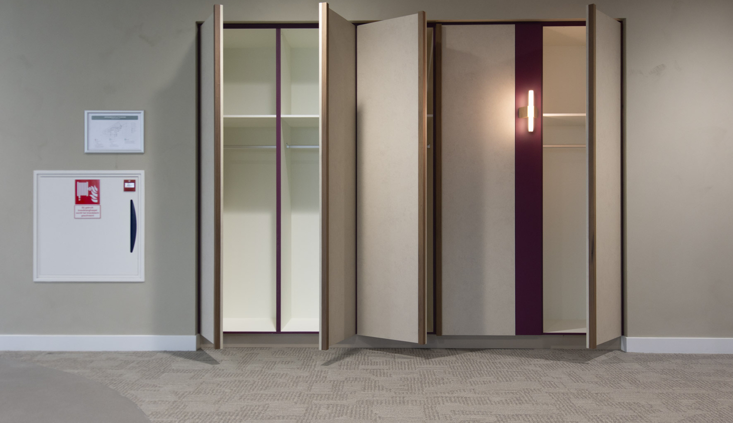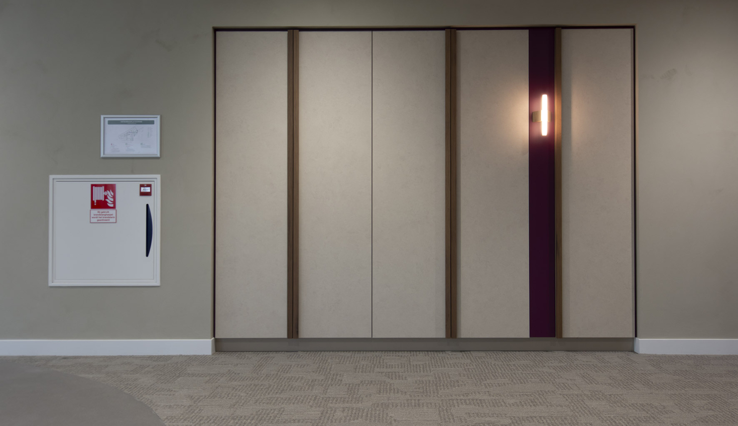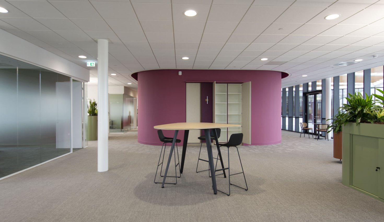 Gesloten oogt de ruimte rustig, geopend is alles direct functioneel. Materialen zoals PETfelt dragen bij aan een goede akoestiek en een zachter totaalbeeld.