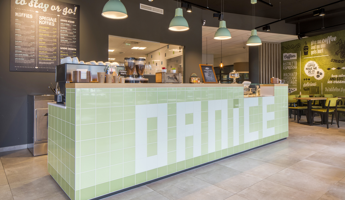 Het concept van Danice is meteen duidelijk. Zij streven naar puur genieten van volle zachte smaken, werken uitsluitend met natuurlijke grondstoffen en vers fruit. Daarom is er in het interieurontwerp gekozen voor een open keuken, zodat je kunt meekijken tijdens het bereiden van het ijs. Er is een helder witte ijscounter waar de kleuren van het ijs nog smaakvoller in uitkomen. Een koffiecounter met een zachte groen tegelwerk in een patroon als tegenhanger van de frisse en kleurrijke visualisatie van vers fruit op achterwand bij de ijscounter.
