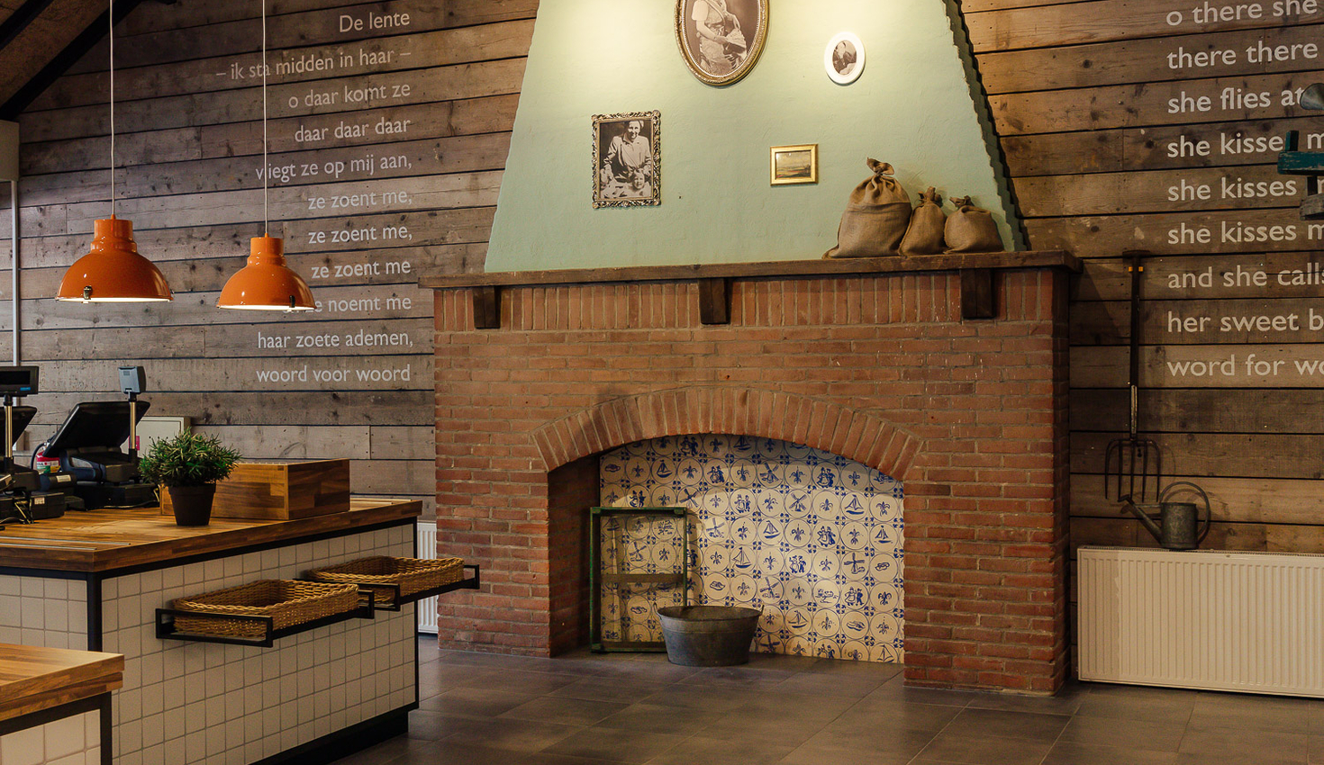 Het interieurontwerp van Coster Design vindt zijn inspiratie bij Koningin Wilhelmina en de poëzie uit haar tijd, vertaald naar een eigentijdse horecaomgeving.