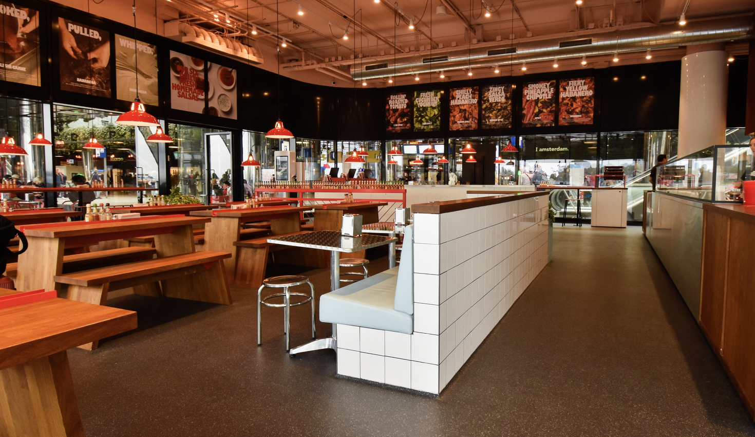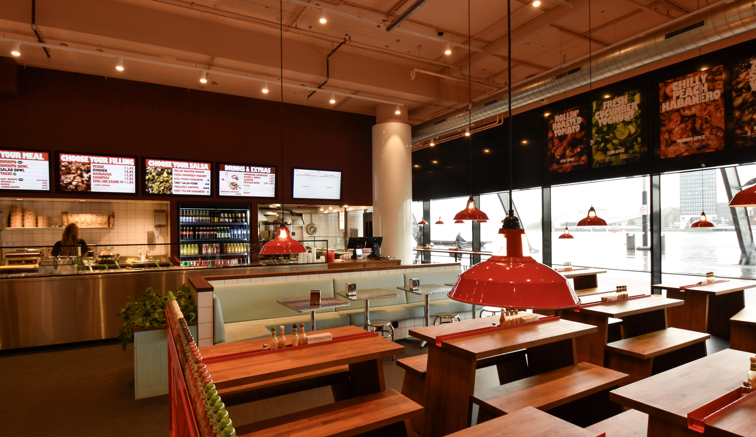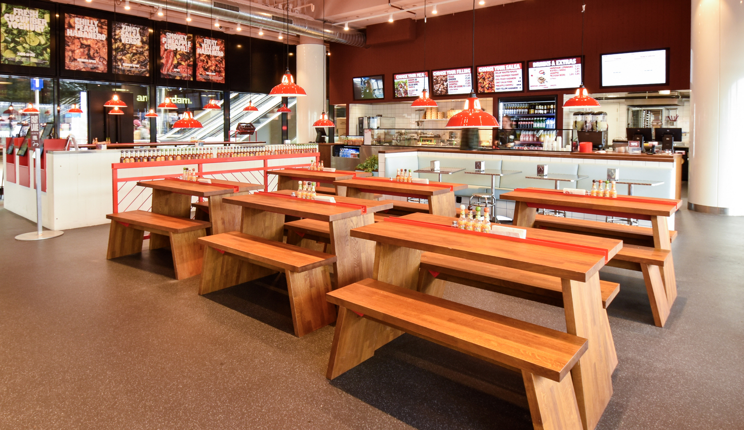 De meubels zijn gemaakt van verschillende materialen. Zowel de hoge tafels als de lage tafels, zijn gemaakt van massief eiken hout. Een leuk detail aan de tafels zijn de rood stalen goten voor de salsa flesjes. De stalen bank is afgewerkt met massief houten latten op kleur. De counter is afgewerkt met RVS en gebeitst eiken. Voor de counter staat een rood stalen divider. Het interieur blijft in beweging passend bij de tijd, zo efficient mogelijk en passend bij het merk.