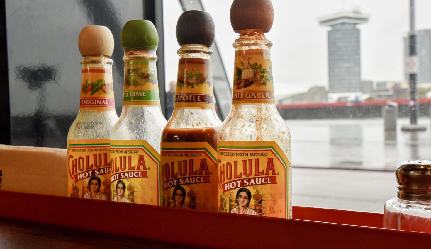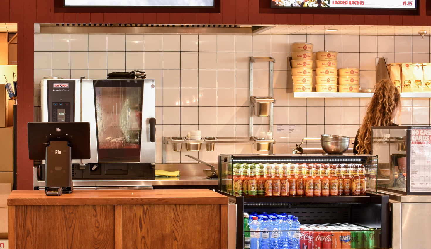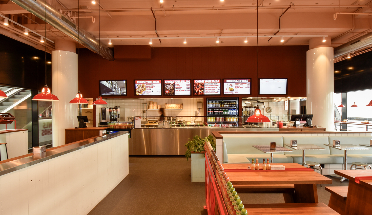 De meubels zijn gemaakt van verschillende materialen. Zowel de hoge tafels als de lage tafels, zijn gemaakt van massief eiken hout. Een leuk detail aan de tafels zijn de rood stalen goten voor de salsa flesjes. De stalen bank is afgewerkt met massief houten latten op kleur. De counter is afgewerkt met RVS en gebeitst eiken. Voor de counter staat een rood stalen divider. Het interieur blijft in beweging passend bij de tijd, zo efficient mogelijk en passend bij het merk.