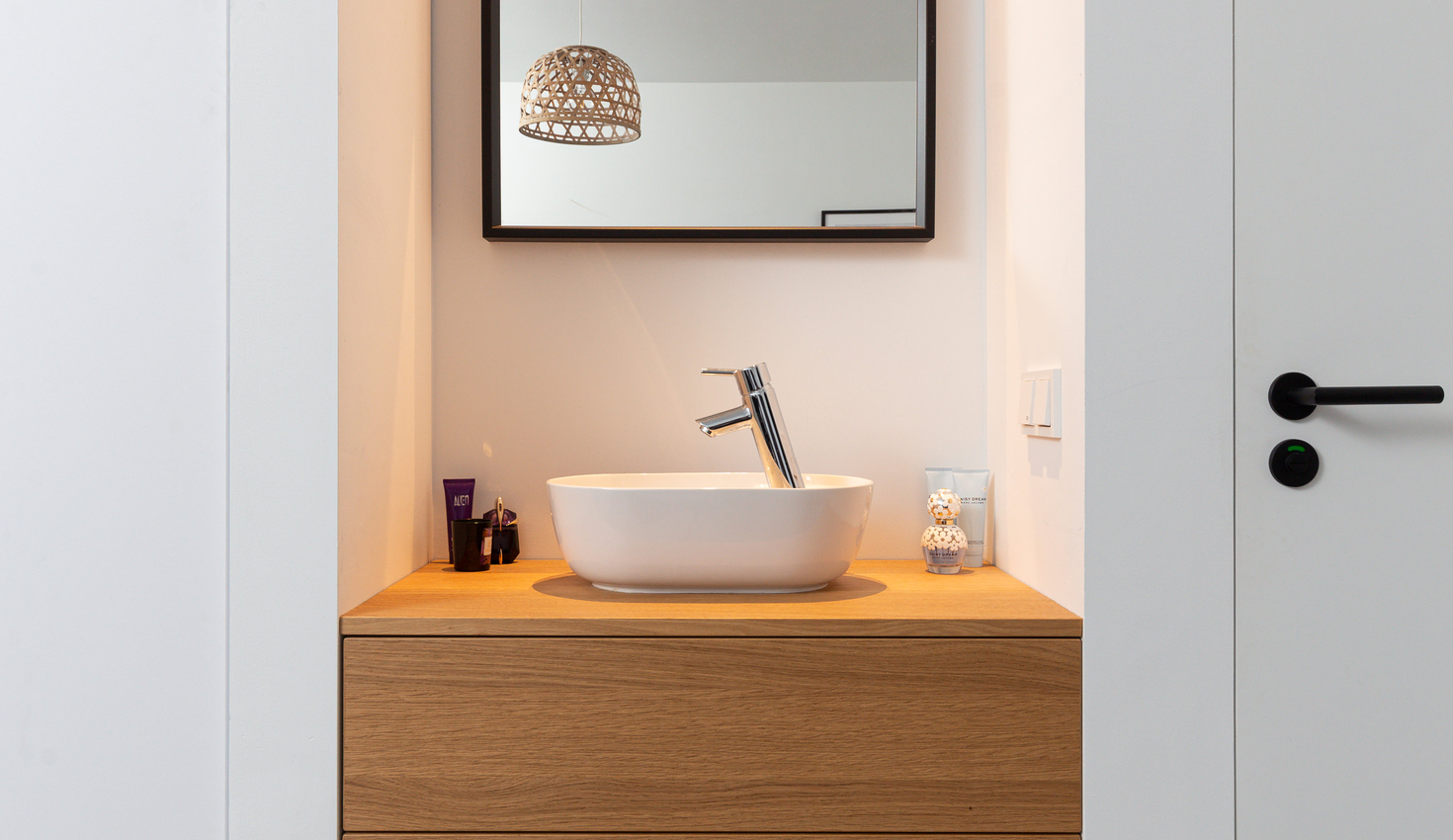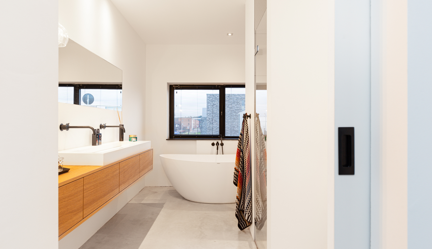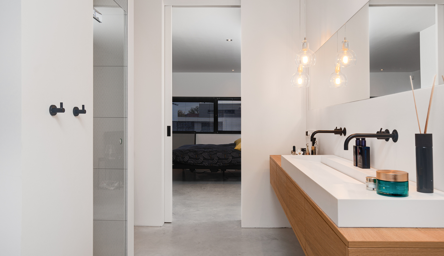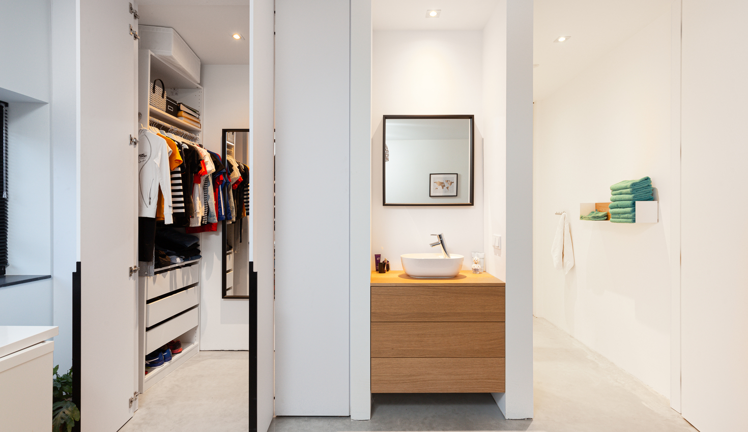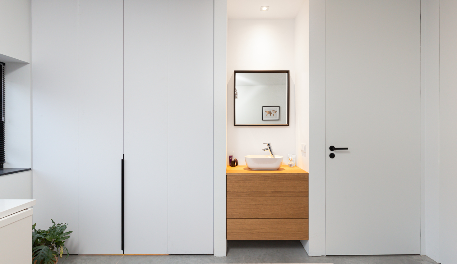 Een verkleinde versie van het wastafelmeubel komt terug in de slaapkamer. In diezelfde ruimte is achter een kastenwand een werkplek verscholen.