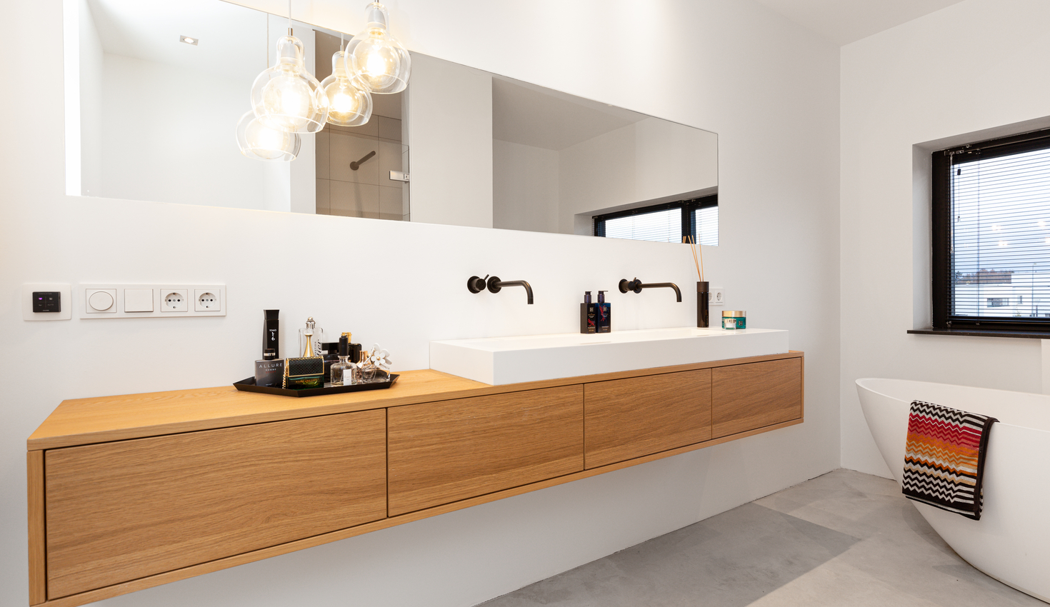Op basis van de wensen van de opdrachtgever heeft Redie daarnaast een badkamermeubel gerealiseerd. Het lange wastafelmeubel is uitgevoerd in eiken fineer. De lange lijnen en het moderne materiaal zorgen voor een strakke en luxe uitstraling. De wasbak, die uit een stuk is gemaakt, is van het materiaal HI-MACS.