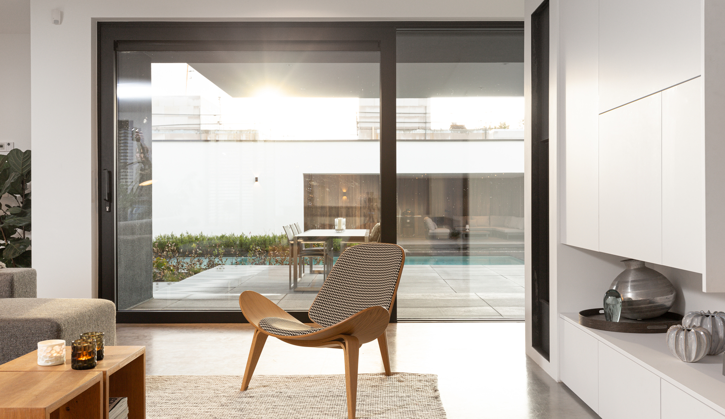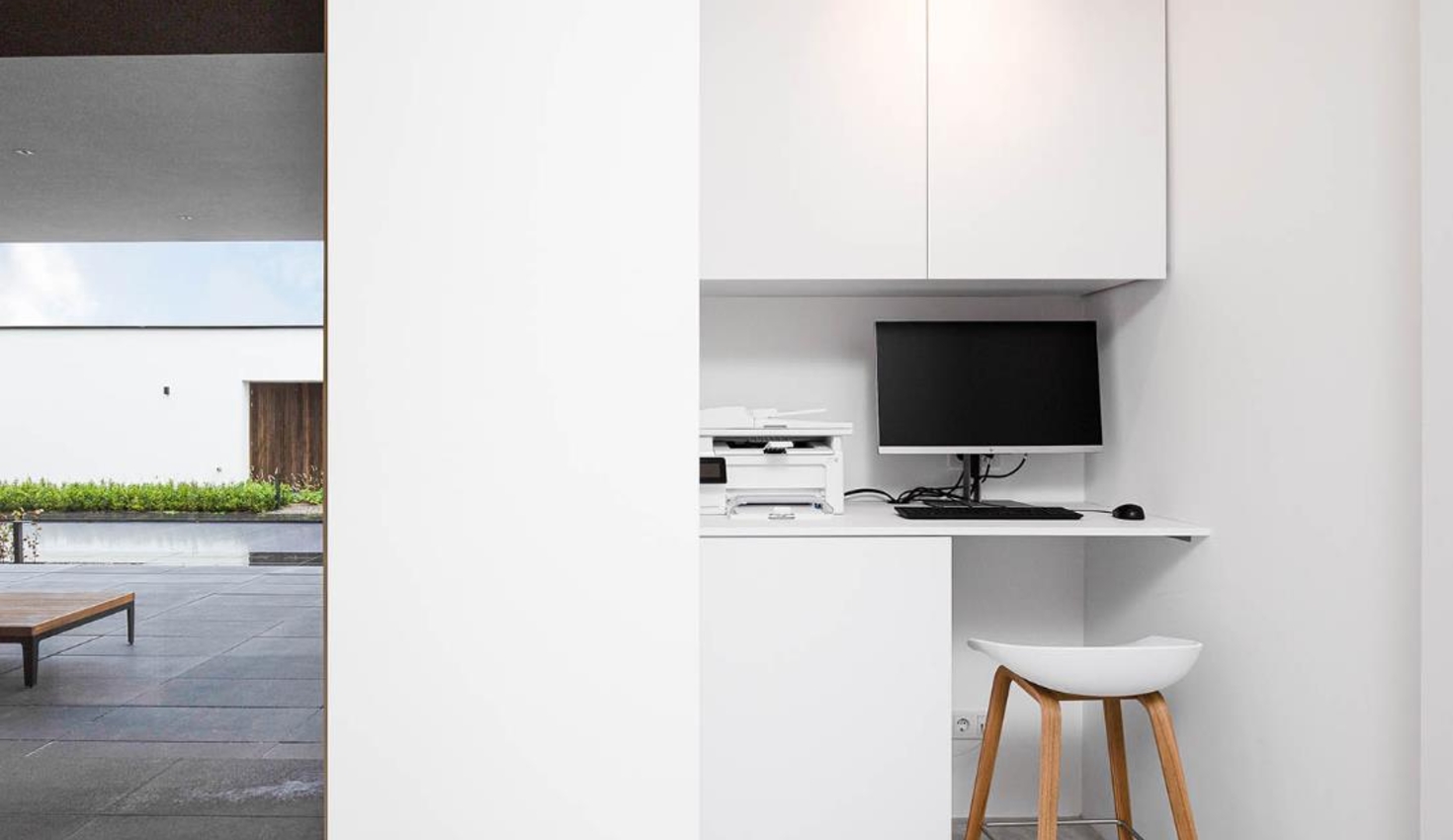 Deze werkplek is gemaakt van hetzelfde materiaal als de kastenwand in de living (HPL), voor een eenduidige uitstraling in de hele villa.