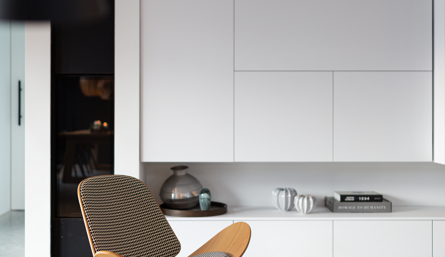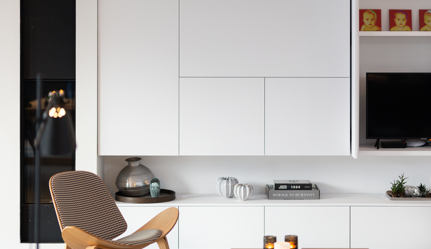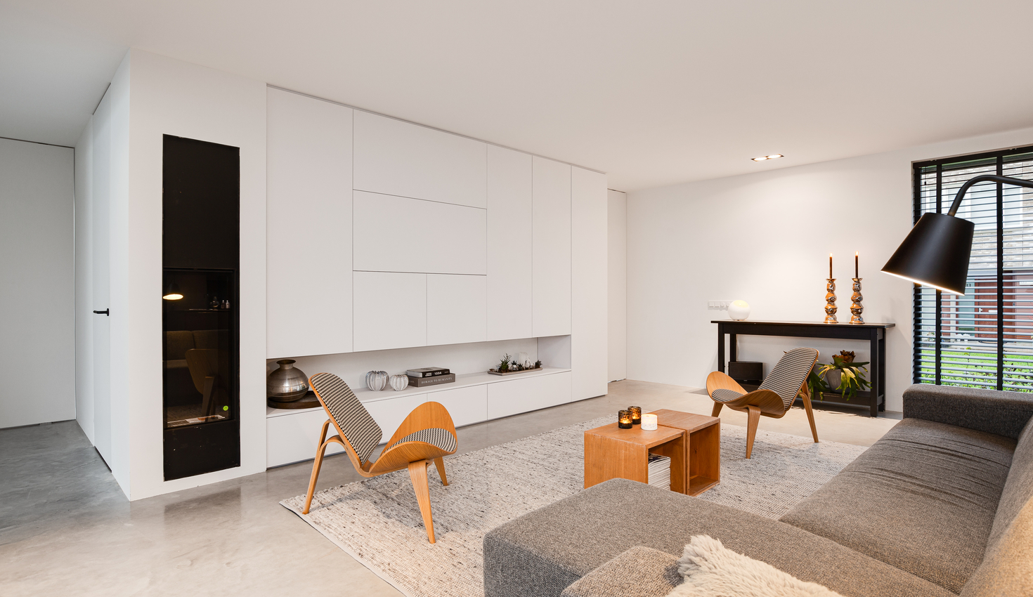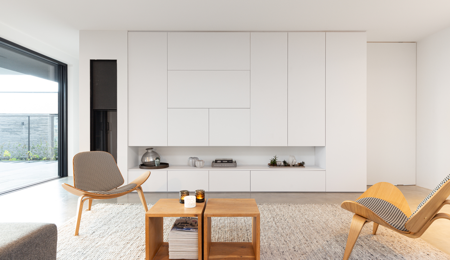 In de living is een witte kastenwand gemaakt van het materiaal HPL.