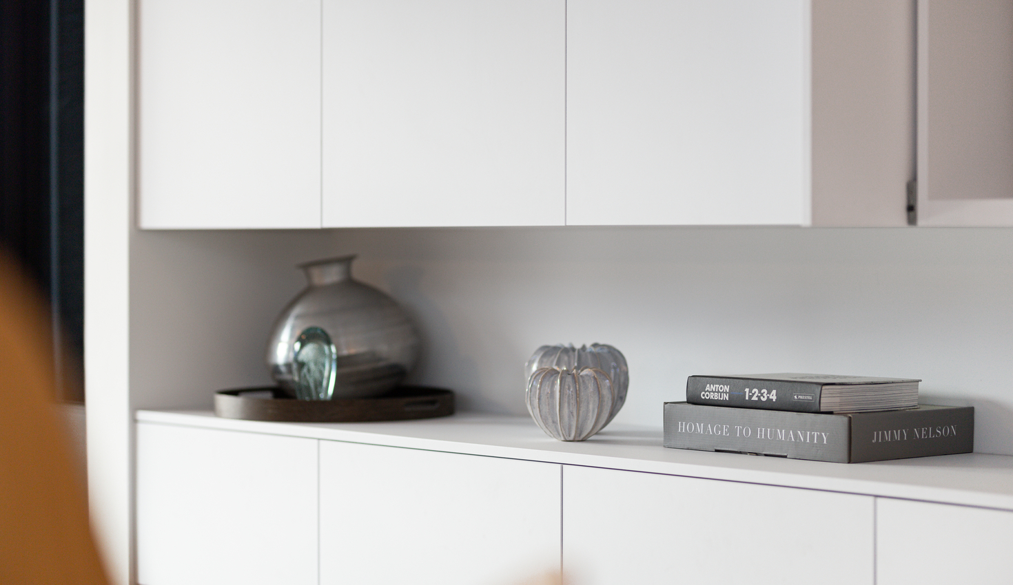 Het strakke meubel biedt veel bergruimte. Zo bevat een van de kasten bijvoorbeeld de tv, die door de greeploze deur is wegwerkt als deze niet in gebruik is. Aan de onderzijde van de kast is een horizontale uitsparing gemaakt die ruimte biedt aan accesoires.